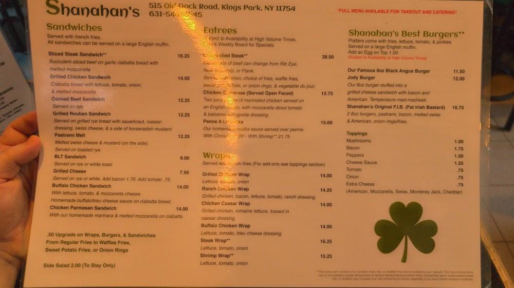 Welcome to Shanahans Bar & Grill, your local destination for exceptional dining and entertainment in Kings Park, NY. With a commitment to top-notch customer service, we proudly offer a menu filled with traditional fare, local specialties, and an extensive selection of craft beers and cocktails. Enjoy your meal on our inviting terrace, or take advantage of our takeout and delivery services. Whether you're here for lunch, dinner, or a lively karaoke night, we guarantee satisfaction with every visit. Join us at 515 Old Dock Rd for great food, fast service, and a vibrant atmosphere perfect for everyone!