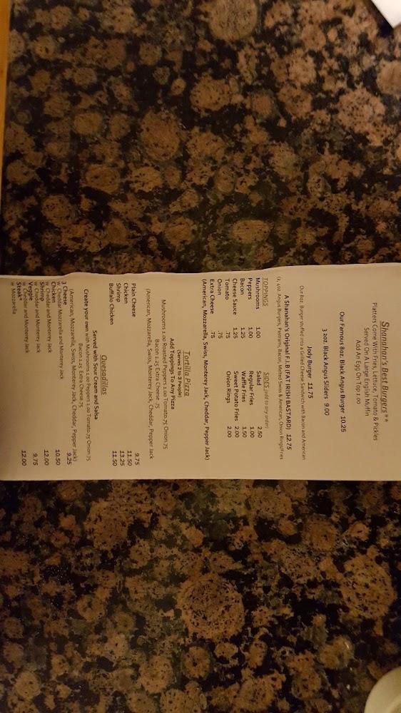 The menu at Shanahan's offers a diverse selection. Expect appetizers like mozzarella sticks and fried pickles. Their quesadillas, including chicken and steak options, satisfy cravings. For lovers of comfort food, numerous fries, and salad combinations tempt diners.